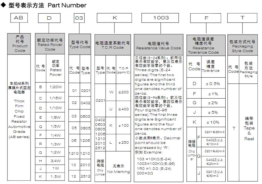 風(fēng)華車規(guī)AB系列厚膜片式固定電阻器型號(hào)命名規(guī)則:
