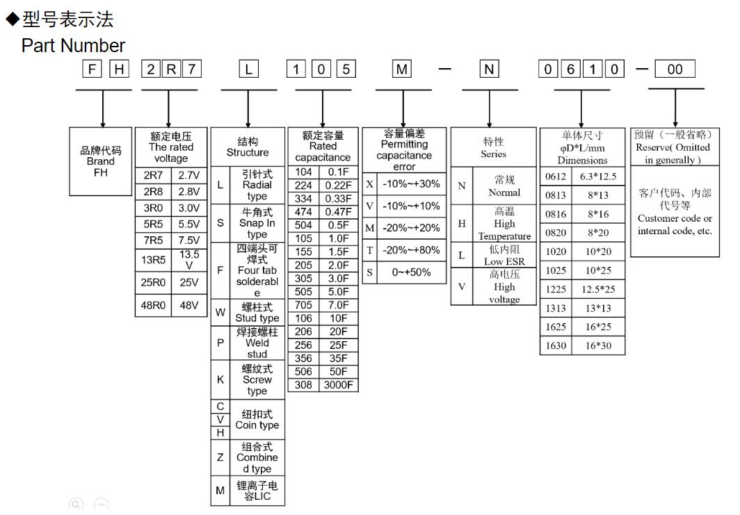 風華高科圓柱型超級電容器型號命名規則: