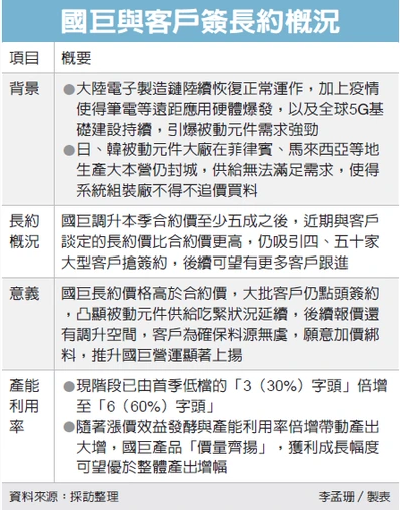 國巨董事長陳泰銘認為,5G時代,各式新型應用裝置的應用,將帶來前所未見的龐大被動元件需求。國巨(14)日表示,部分大型客戶已簽訂長約適用,預期將有更多的大型客戶陸續(xù)簽訂長約,以確保供貨無憂;至于長約價格則依不同客戶而有差異,無法透露。