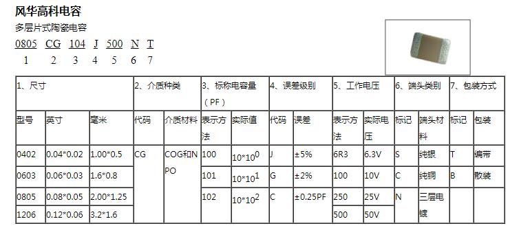 【CG】 2、介質種類:介質種類。由貼片電容介質及特性介紹我們貼片電容的所謂介質實際上是該電容的代表著工作溫度。介質不同工作溫度不同。風華通用型貼片電容介質有5種,分別用CG(c0g或NPO)、B(X7R)、F(Y5V)、X(X5R)、E(Z5U)表示。