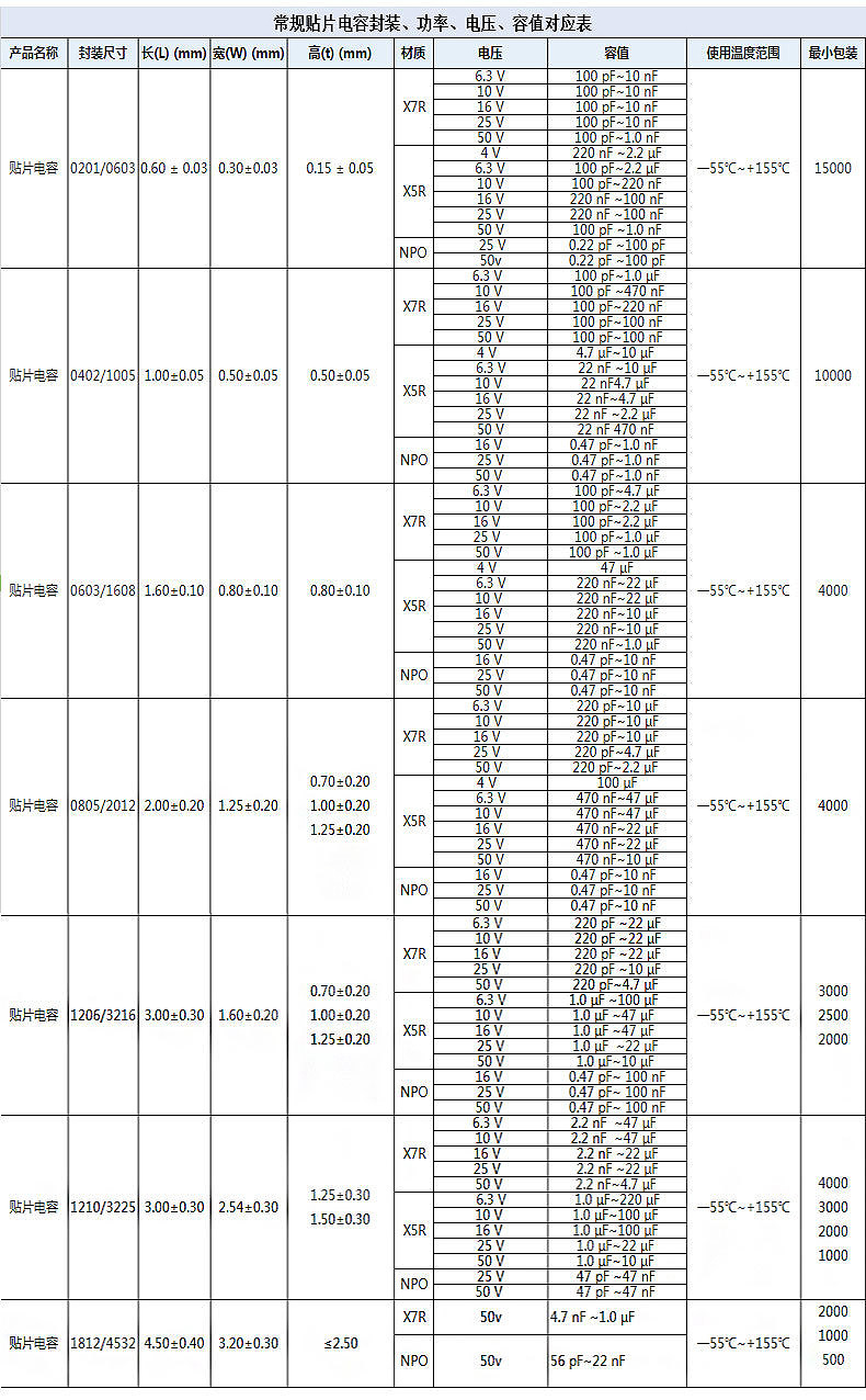 貼片電容封裝,功率,電壓,容值對應表