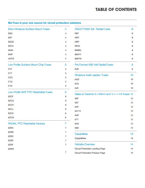 1、磚微型表面貼裝保險絲 2、薄型表面貼裝芯片保險絲 3、薄型SMD可復位器件 4、徑向PTC自恢復設備 5、250/277/350伏徑向保險絲 6、預制600V徑向保險絲 7、微型軸向引線保險絲 8、玻璃和陶瓷保險絲
