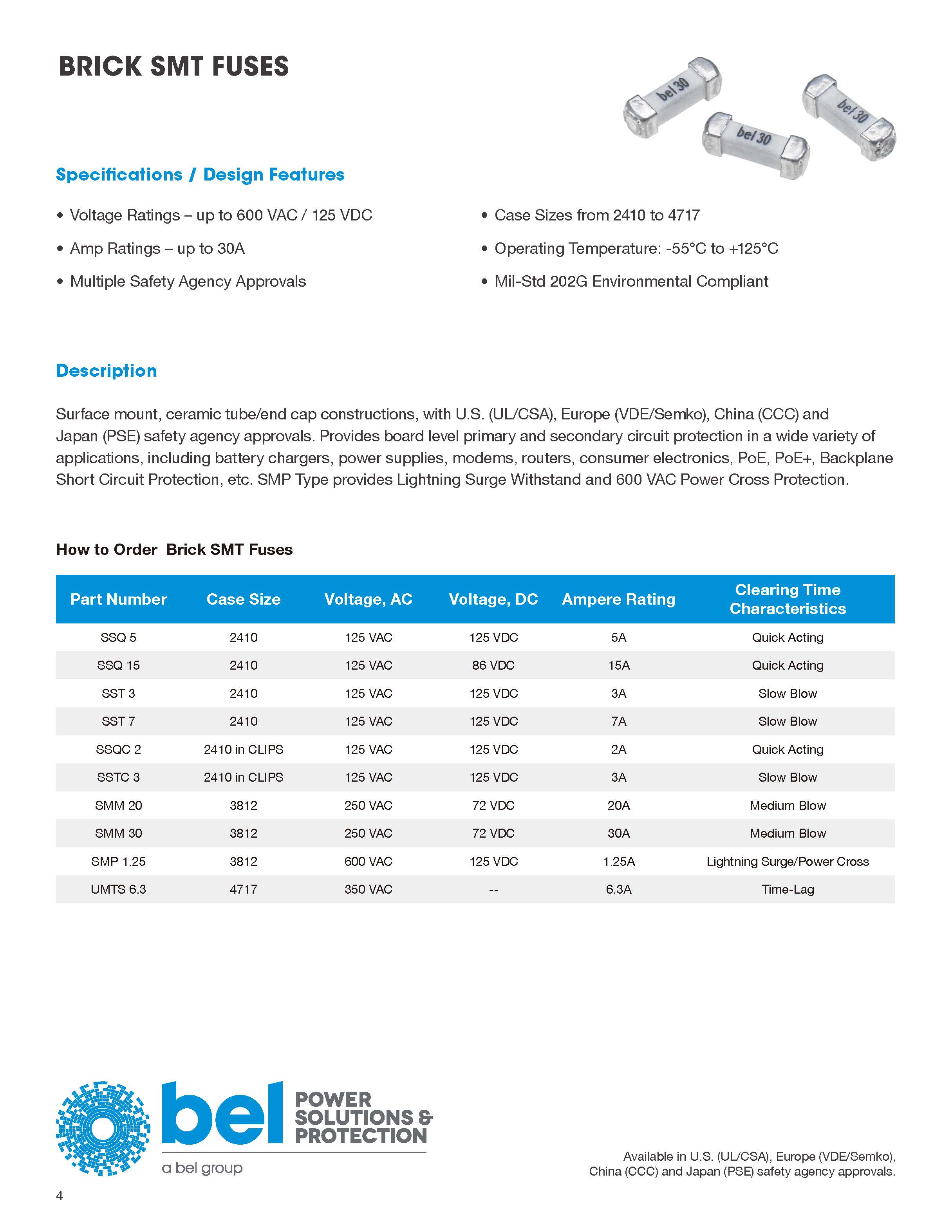 表面貼裝,陶瓷管/端蓋建筑,與美國(UL / CSA),歐洲(VDE / SEMKO),中國(CCC)和日本(PSE)安全機構(gòu)批準。 提供各種各樣的板級初級和二級電路保護應用,包括電池充電器,電源,調(diào)制解調(diào)器,路由器,消費電子,PoE,PoE +,背板短路保護等。SMP型提供閃電浪涌耐受和600 VAC電力交叉保護