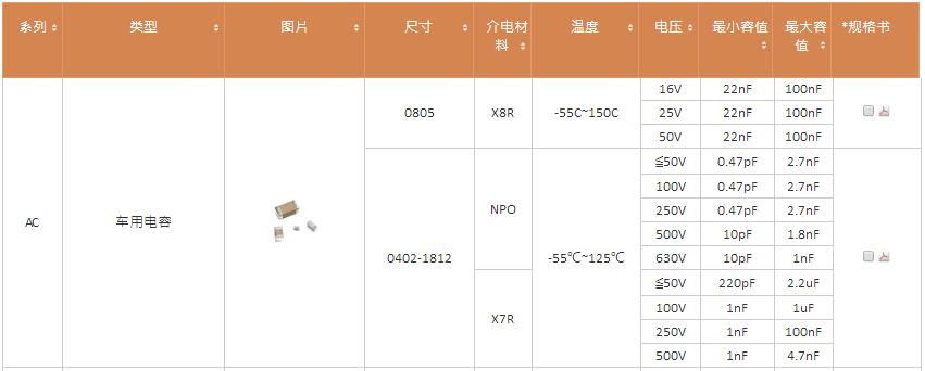作為世界主要的積層陶瓷電容供貨商,國巨提供車用電容,AC系列。相較于泛用型陶瓷電容,AC系列其穩定性符合AEC-Q200標準。車用電容包含AC, AS, AQ 及 AC HiTemp 系列。